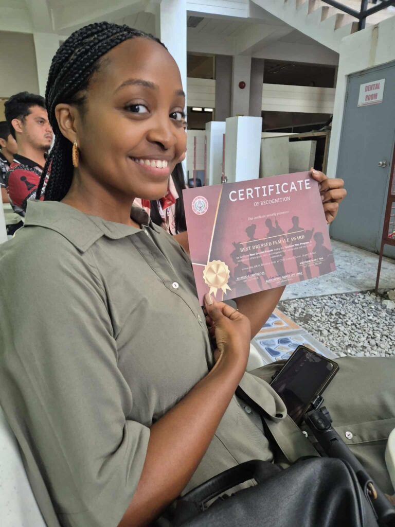 Bianca posing for a pic at the graduation ceremony of CVIF, with her housemate Alfilgen Sebandal, and co-teacher for Physics, Prince Nayga.