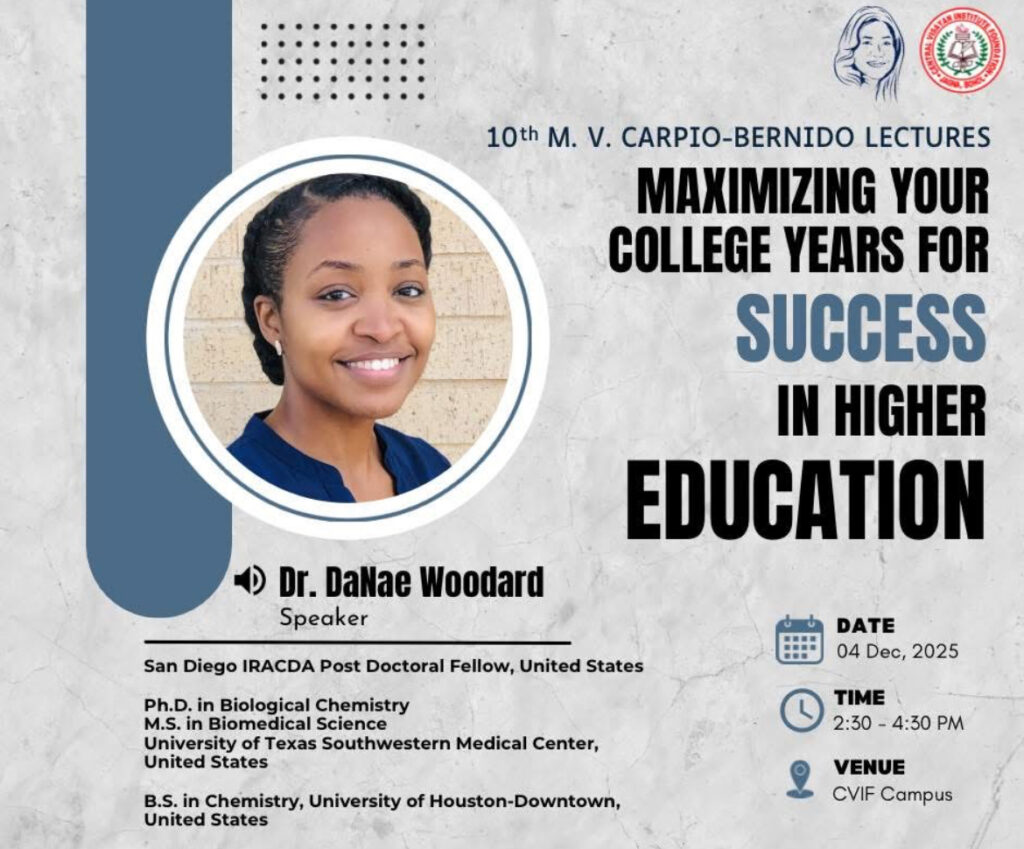 Bianca giving a career talk entitled “Fun Topics in Physics” to Grade 11 CVIF Students as part of the MVCB Lecture Series of CVIF in honor to the late Maria Victoria Carpio-Bernido (top) and Bianca answering students’ questions after her talk (bottom).