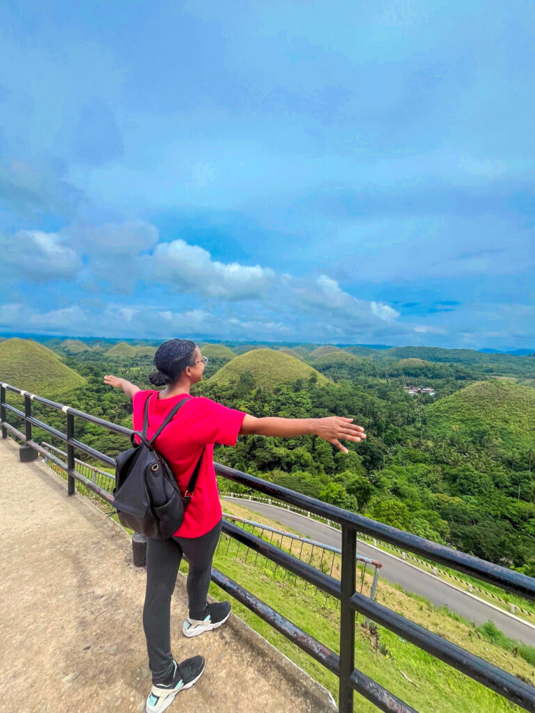 Bianca posing for a picture with Bohol’s iconic Chocolate Hills (left) and Bianca jamming and dancing with the performers during the Loboc River Cruise (right).