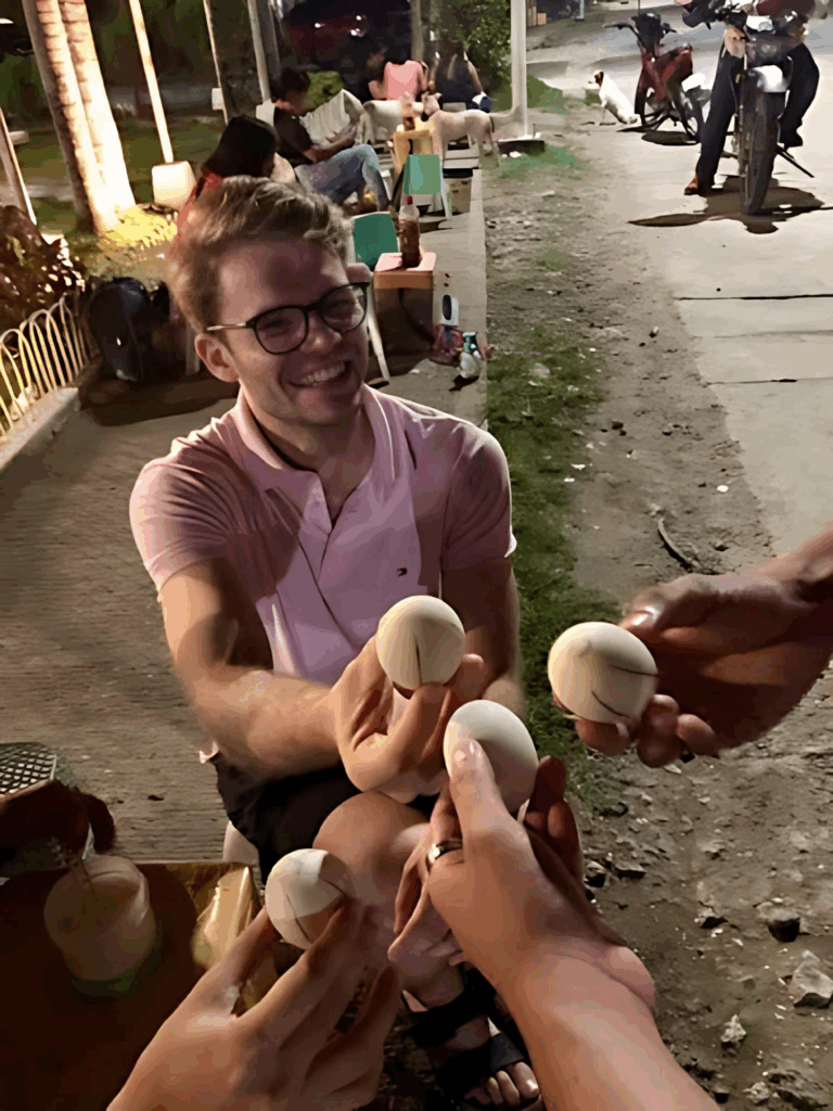 Markus trying on Penoy (a milder version of balut – a Filipino delicacy)